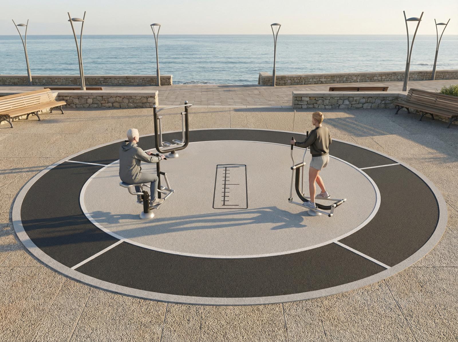 Estructura, Metal: Tubo S235 de acero galvanizado y pintado en el horno. Sus dimensiones son ø114mm x 2,5mm de espesor. Partes móviles y tubos de conexión: ø60mm /ø48mm x 2 mm de espesor. ø38mm / ø32mm x 2mm de espesor. Pintura: 1 mano de lacado en polvo constituido por mezcla de resinas poliéster, endurecedores y pigmentos, exento de plomo y con alta resistencia a la meteorización. Combinación de colores: Negro mate y Gris metalizado RAL9006