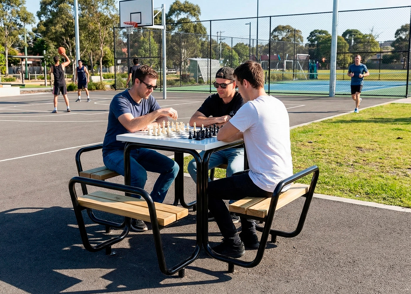 Mesa AJEDREZ, medidas totales (ancho x alto) 1850x750 mm, fabricada con tablones en madera de pino (tratados en autoclave vacío-presión clase 4 contra la carcoma, termitas e insectos) y tablero fenólico alistonada a contraveta. Estructura tubular de acero (tratado con el proceso Ferrus el protector de triple capa para el hierro, que garantiza una óptima resistencia a la corrosión). Anclada sobre superficie preparada (suelo blando o suelo duro), con pernos de expansión según superficie y proyecto.