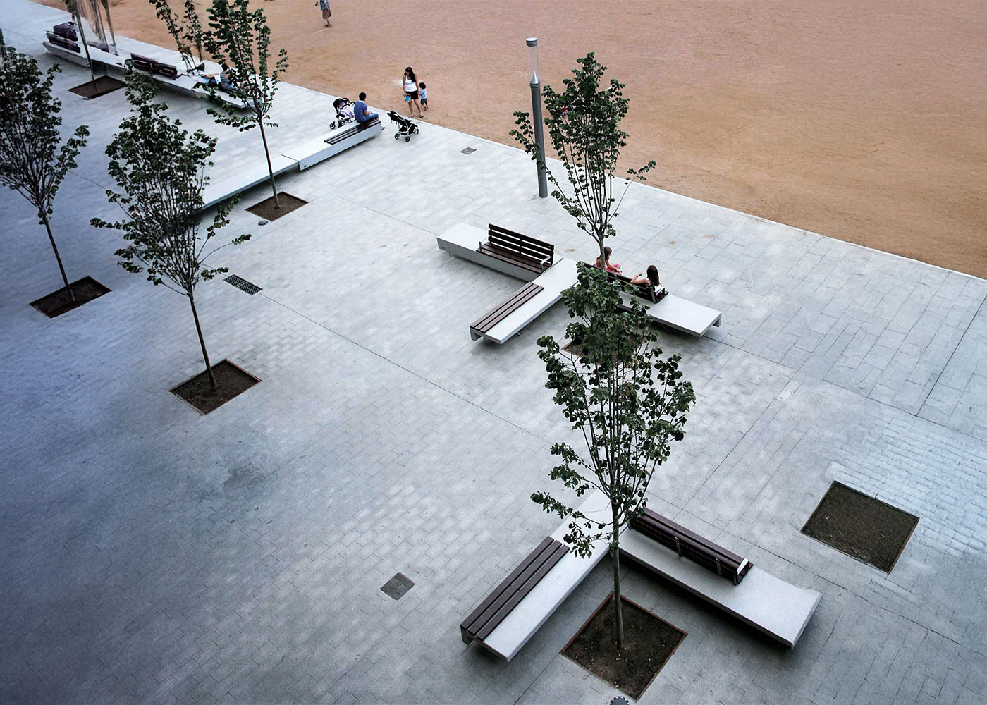 Banco de diseño ELA 3000, medidas totales (largo x alto x profundo) 3000x420x800 mm, fabricado con asiento de hormigón armado hidrófugo moldeado, color blanco granítico pulido, estructura de acero inoxidable mate. Apoyado sobre superficie preparada, por su propio peso.