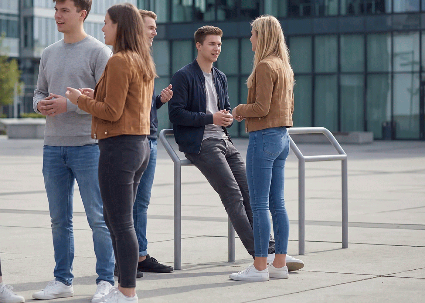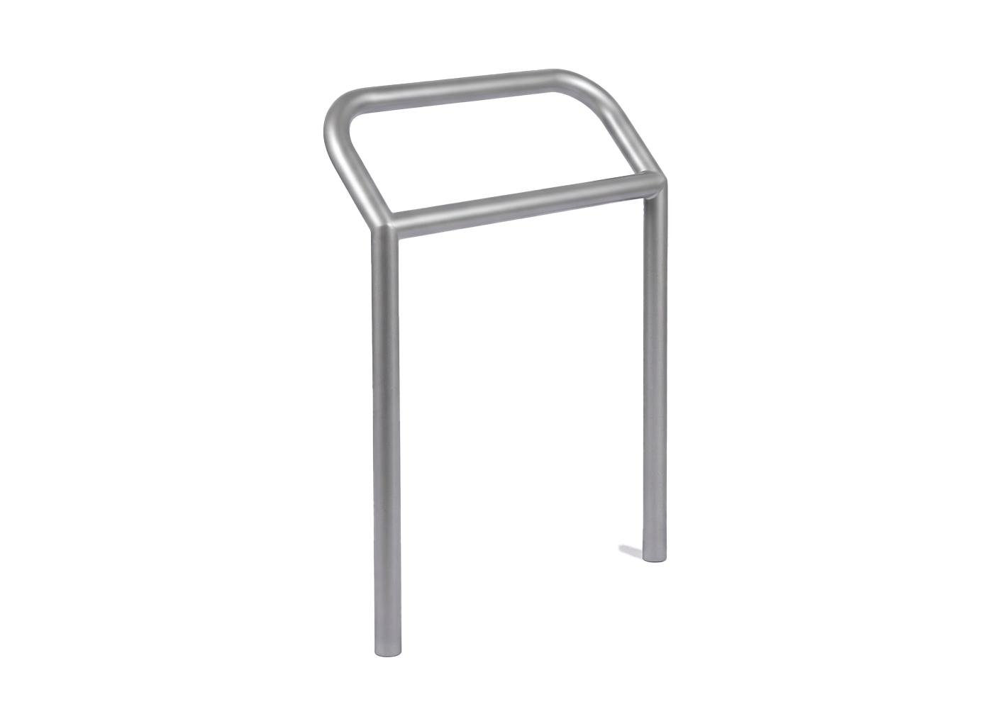 Apoyo isquiático urbano de diseño minimalista, estructura tubular continua en acero galvanizado tratado mediante el proceso Ferrus, un protector de triple capa para el hierro que garantiza una óptima resistencia a la corrosión, con formas redondeadas y líneas suaves, compuesto por dos patas verticales y una barra superior horizontal ergonómica ligeramente inclinada.Acabado en pintura color RAL 9006 superficie uniforme y de alta calidad. Opcional acabado en acero inoxidable. Preparada para anclaje empotrado en el suelo.