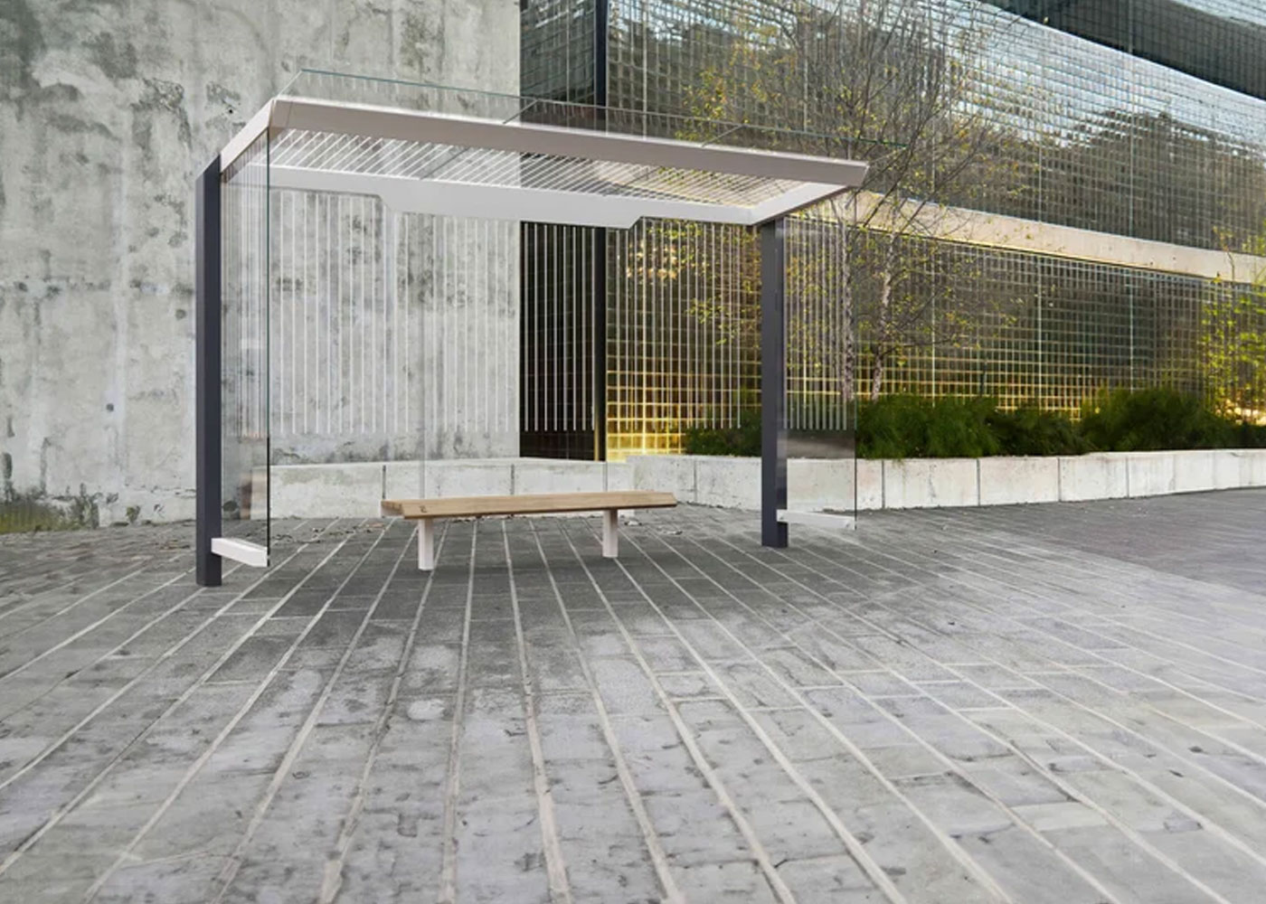 Marquesina de diseño, con estructura fabricada en acero (tratado con el proceso Ferrus el protector de triple capa para el hierro, que garantiza una óptima resistencia a la corrosión). Banqueta en madera tropical tratada con aceite protector. Cristal laminado.
