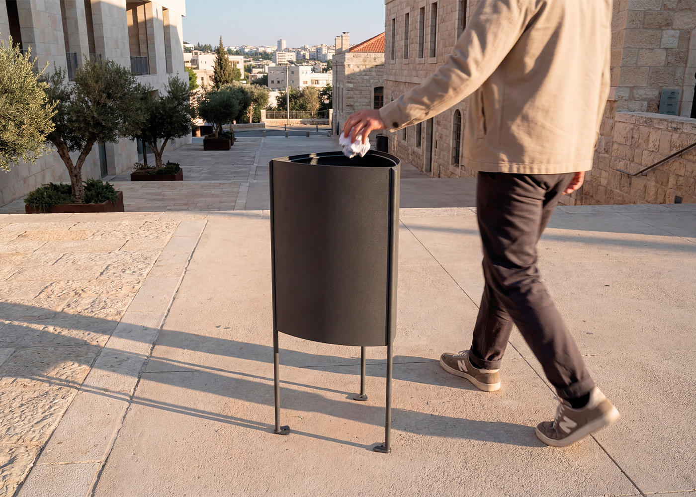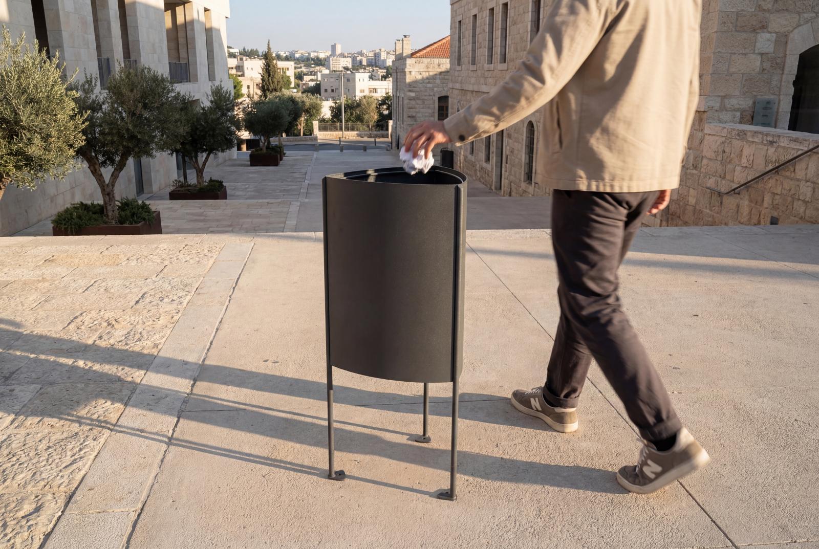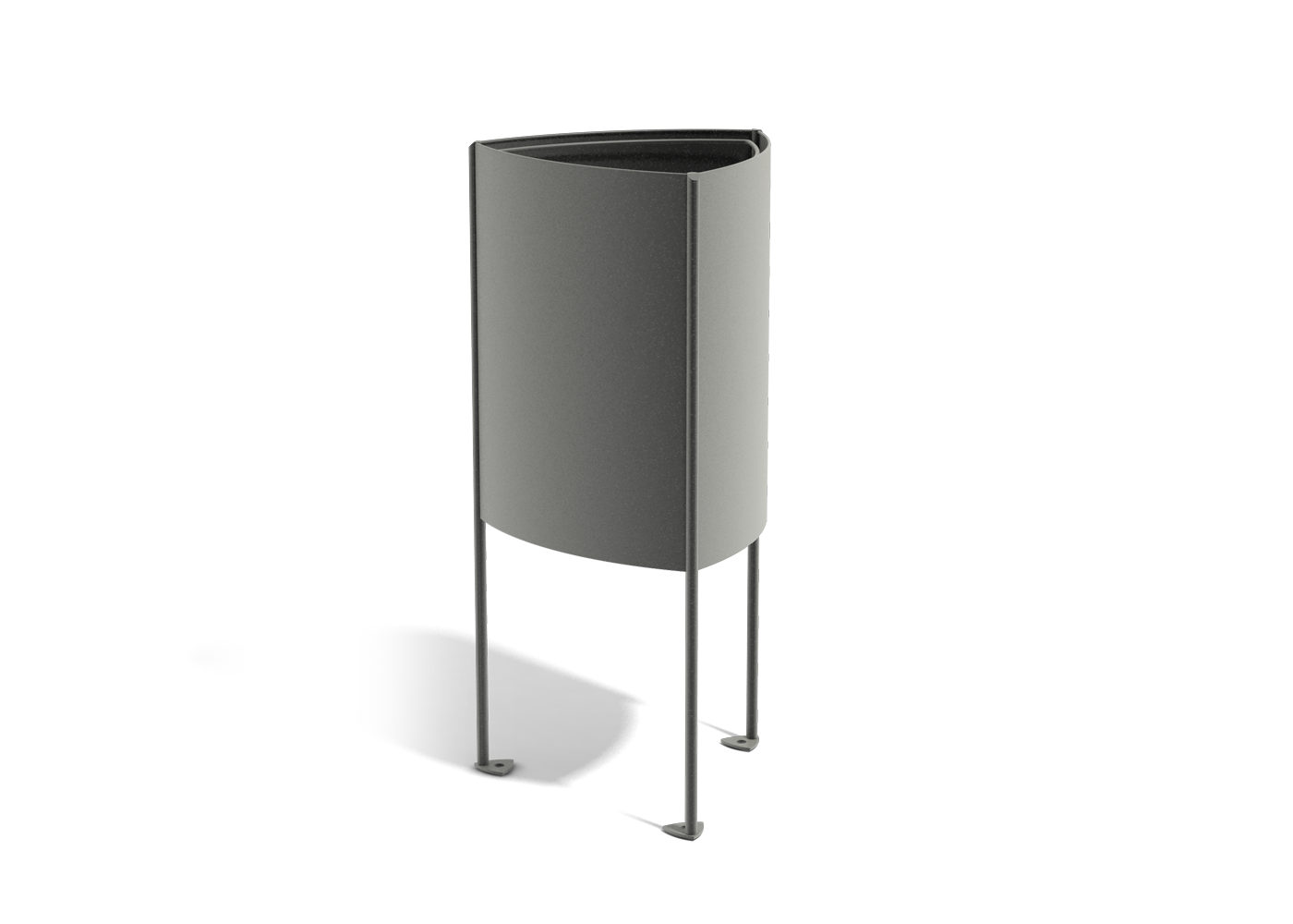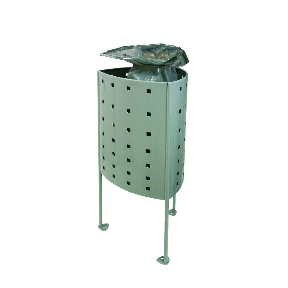 Papelera de diseño ARGO, medidas totales (ancho x profundo x alto) 385x385x825 mm, 50 litros, antivandálica, fabricada con cubeta de acero galvanizada gris (tratado con el proceso Ferrus el protector de triple capa para el hierro, que garantiza una óptima resistencia a la corrosión), apoyada en una estructura maciza y base de anclaje triangular con agujeros para su fijación al suelo. Preparada para anclaje con 3 pernos de expansión M8 según superficie y proyecto.