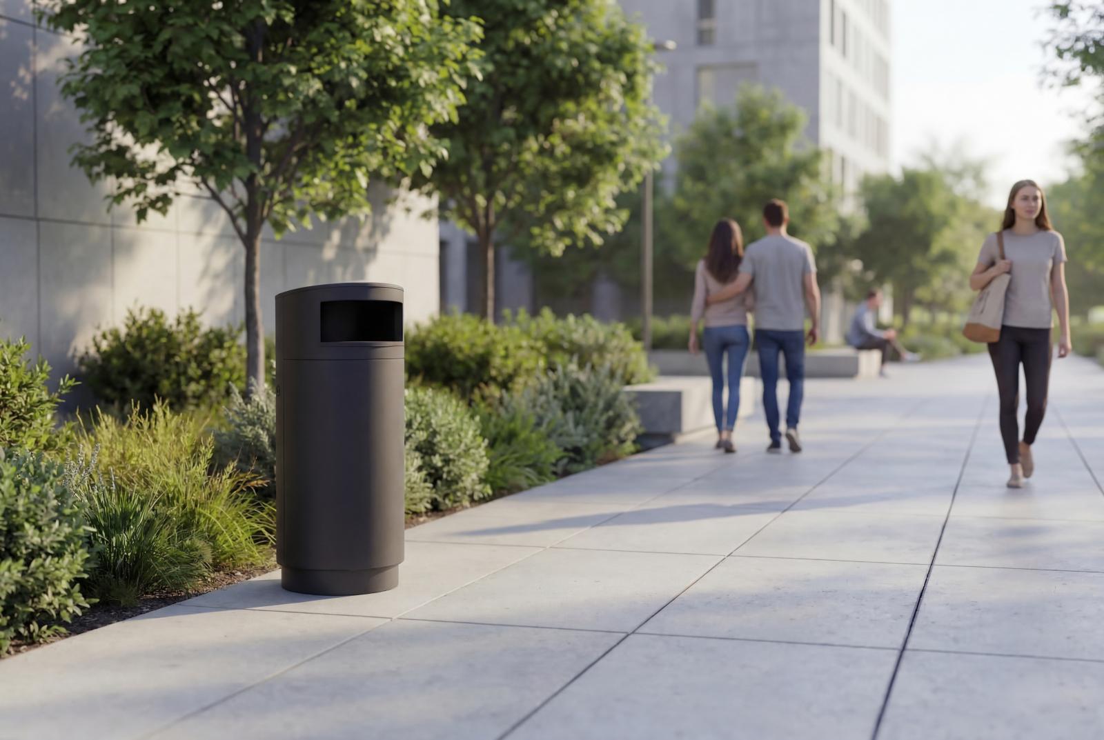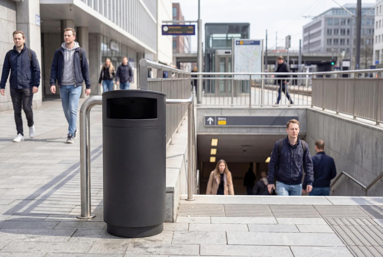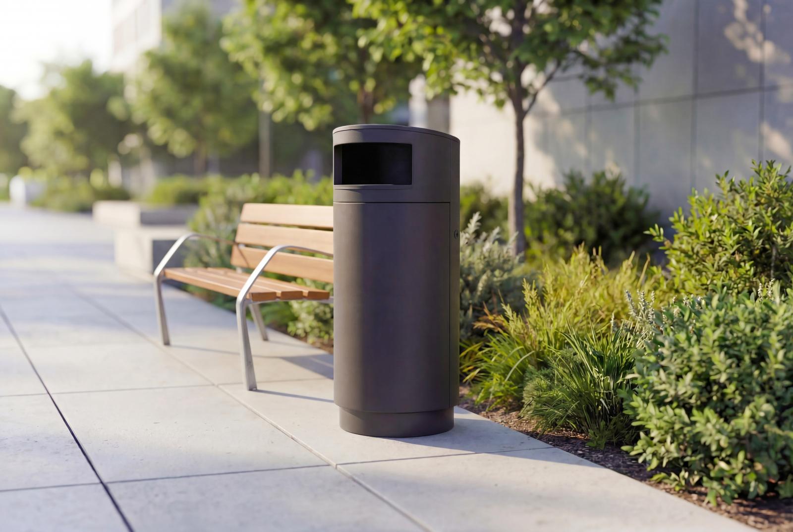 Gran robustez a causa del grosor de la chapa y al esqueleto estructural reforzado. Cierre con clave triangular estándar. Entrada de basura con apertura de 210° que permite el fácil acceso desde tres direcciones diferentes, así siente óptimo para instalar junto a paredes u otros elementos verticales. El sombrero protege el interior de la papelera del viento y la lluvia.