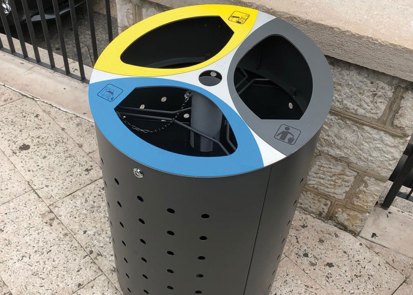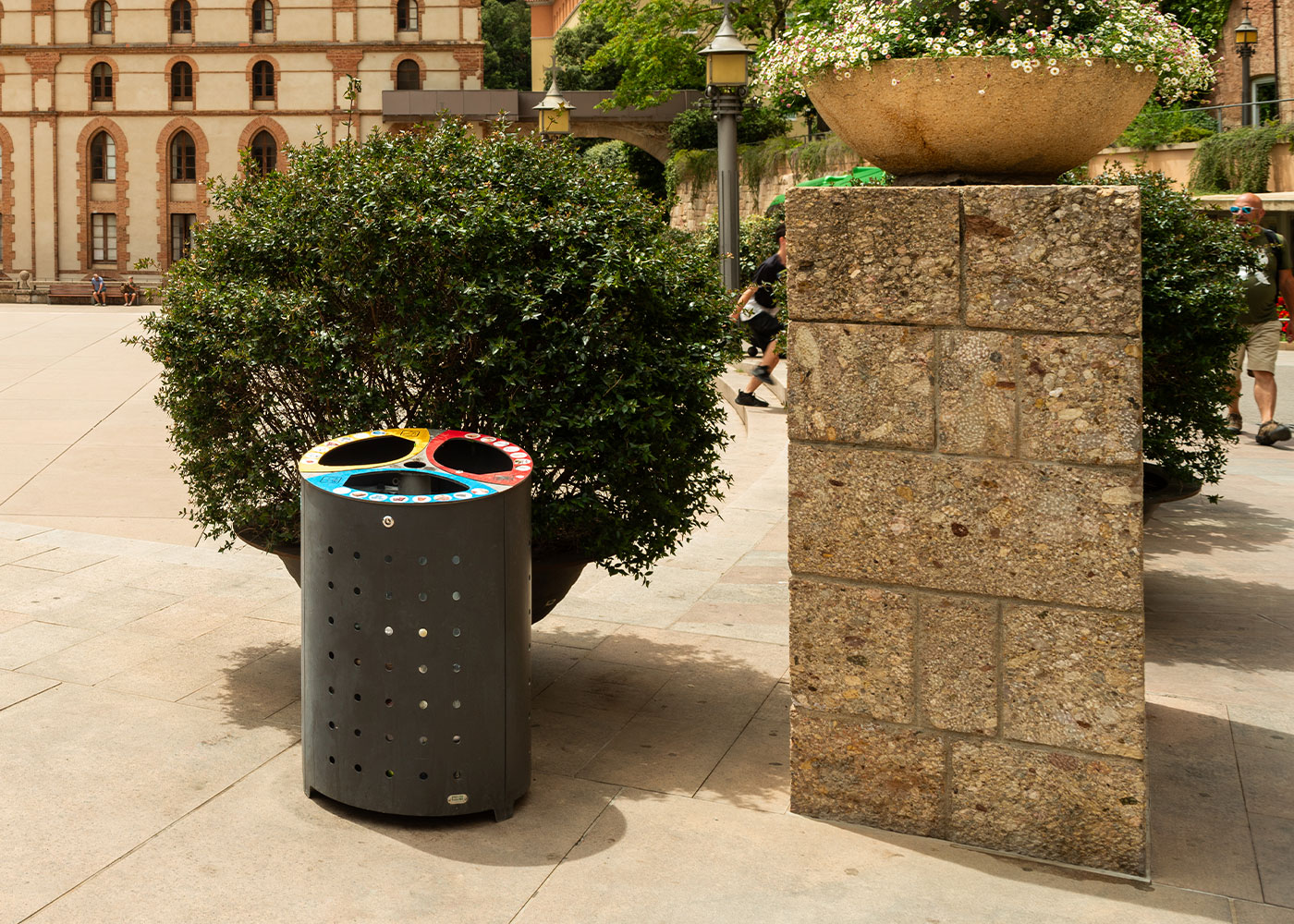 Papelera de diseño DORIA, medidas totales (Ø x alto 1 x alto 2) 620x910x820 mm, 3x75 litros, fabricada en chapa de acero galvanizada (tratado con el proceso Ferrus el protector de triple capa para el hierro, que garantiza una óptima resistencia a la corrosión), con cenicero central (con apaga cigarrillos y cubeta propia) y tres entradas de residuos distintas (con sistema para la sujeción de la bolsa), cada una marcada con el color y pictograma universal, identificativos del residuo. Cierre mediante llave triangular estándar, con sistema de bloqueo automático, para bolsas de 75 litros. Preparada para anclaje con 3 pernos de expansión Ø10 según superficie y proyecto.
