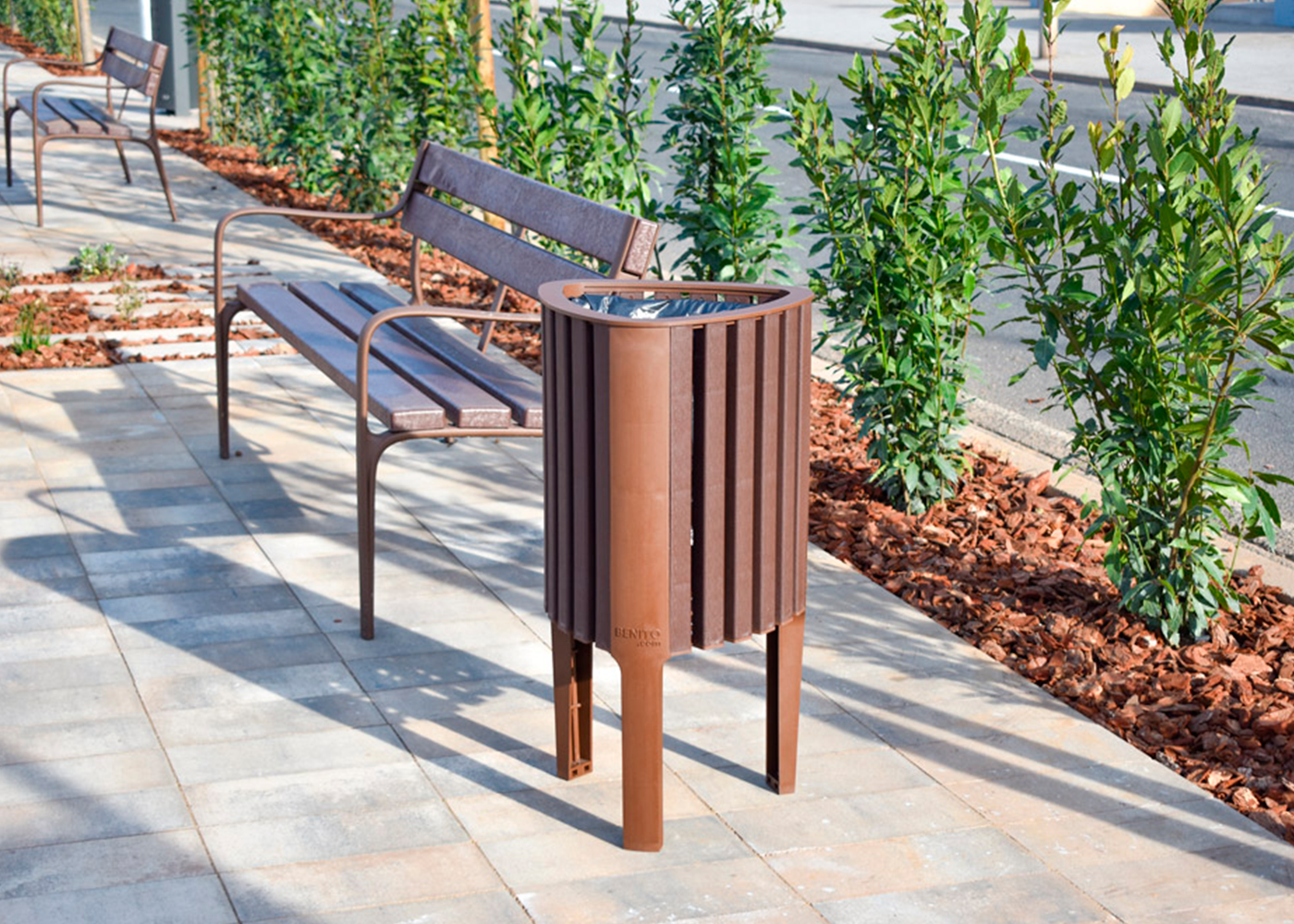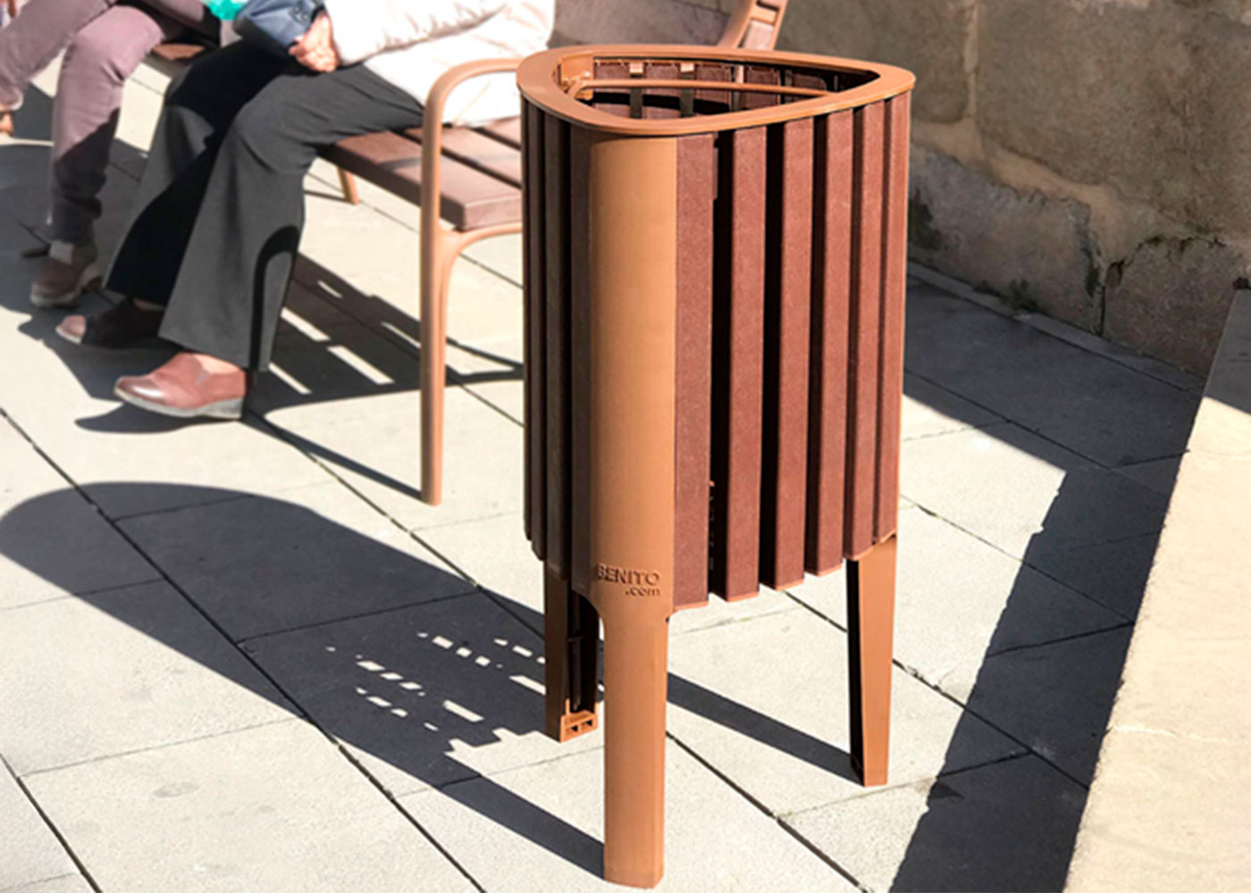 Papelera de diseño GEA en polímero reciclado, medidas totales (ancho x profundo x alto) 440x430x825 mm, compacta y adaptable con aro sujeta bolsas pensado para bolsas de 50 litros, fabricada en plástico ReBnew (el polímero reciclado de BENITO que está producido íntegramente a partir de envases del contenedor amarillo y no requiere ningún tipo de mantenimiento). Preparada para anclaje con tornillos según superficie y proyecto.