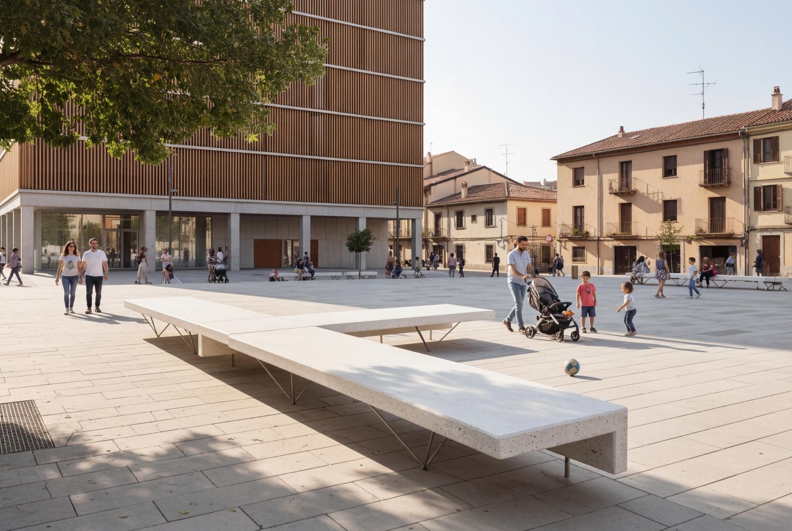 Banco de diseño ELA 3000, medidas totales (largo x alto x profundo) 3000x420x800 mm, fabricado con asiento de hormigón armado hidrófugo moldeado, color blanco granítico pulido, estructura de acero inoxidable mate. Apoyado sobre superficie preparada, por su propio peso.