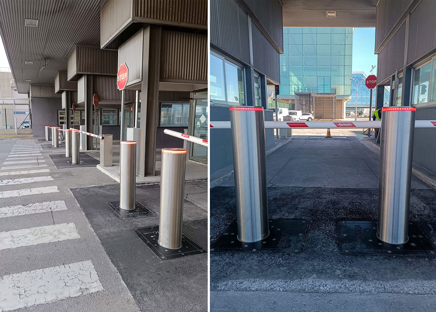 Instalación de pilonas de seguridad modelo Defender en el Aeropuerto de Barcelona-El Prat, destinadas a reforzar la protección y control de accesos en la zona de entrada principal del aeropuerto.