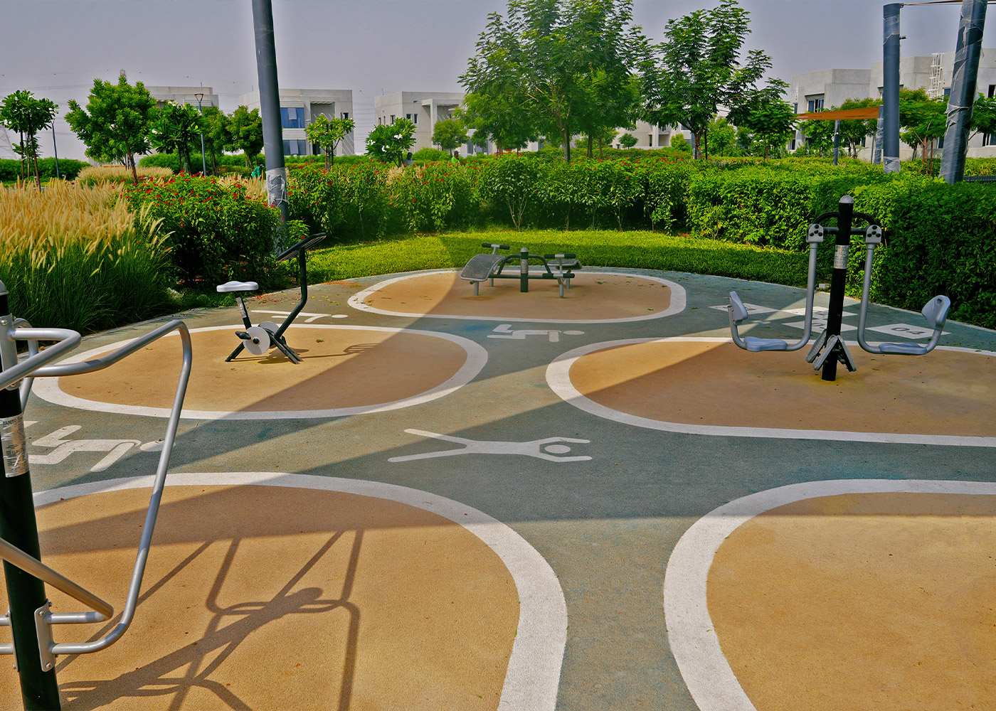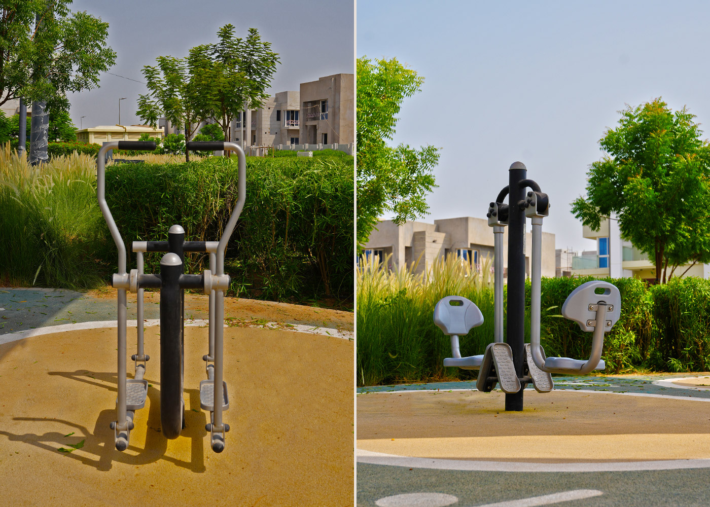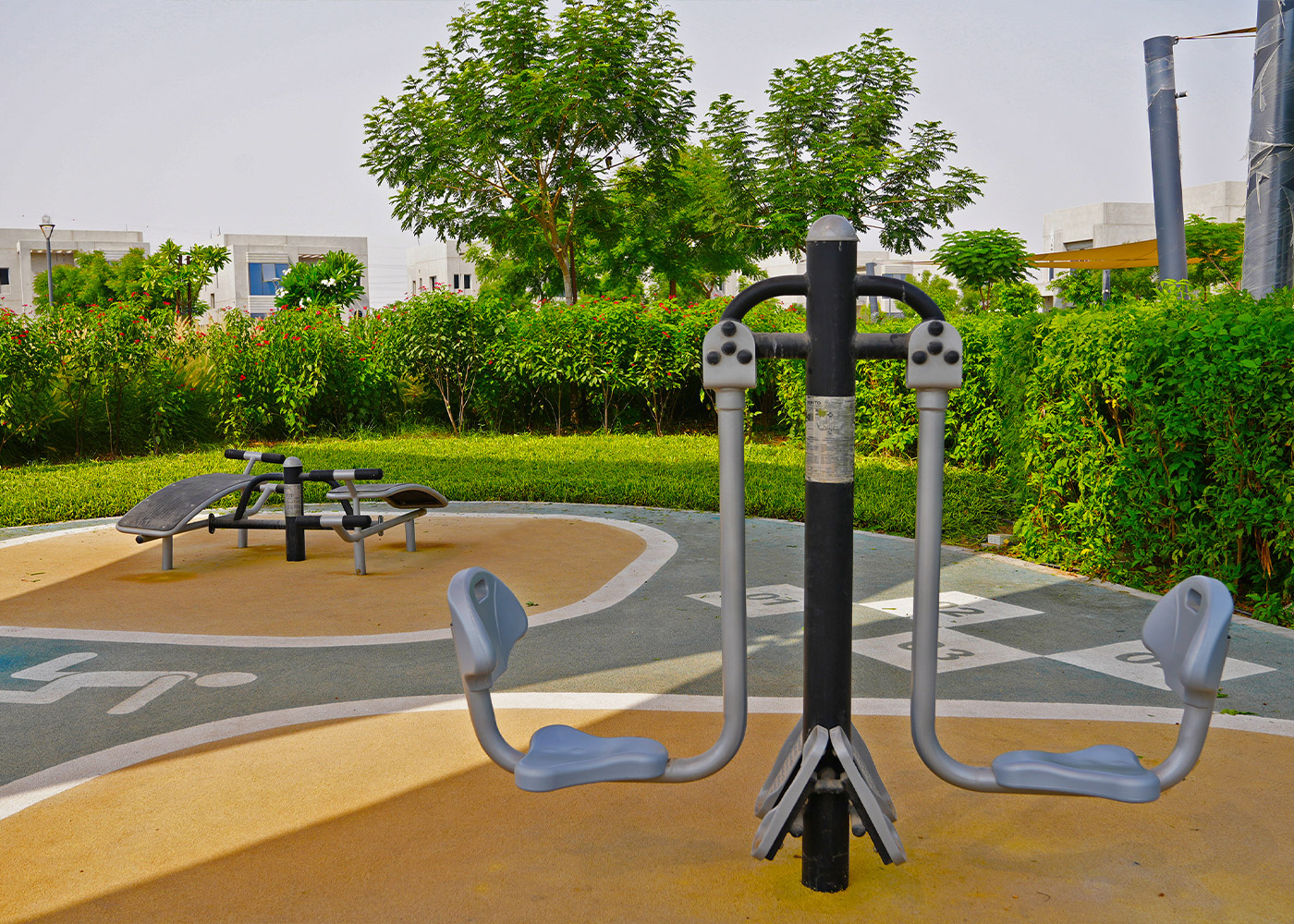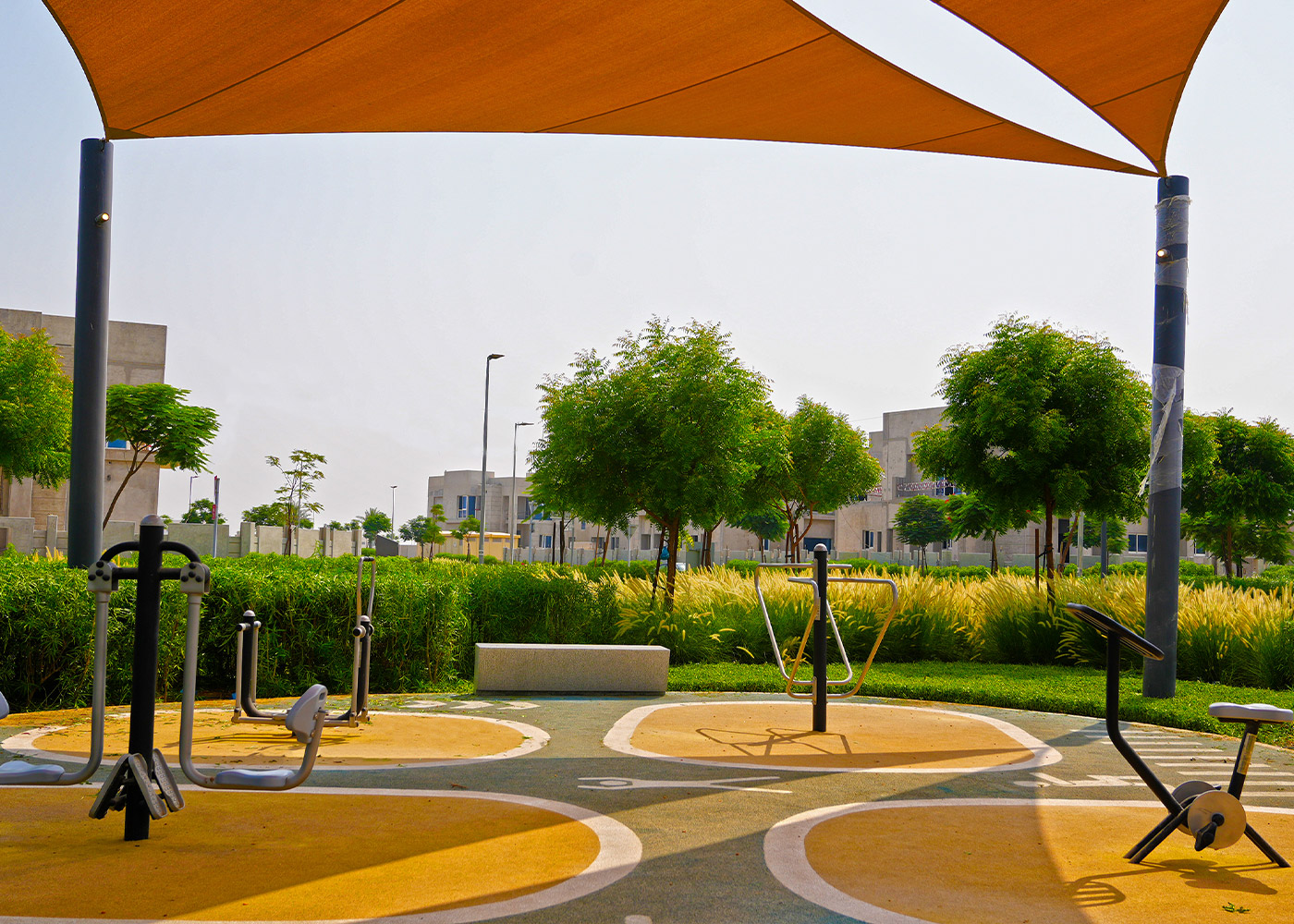 Dentro de este entorno, se ha instalado una nueva zona de elementos saludables, equipada con máquinas de extensión, barras, escalador, estación de abdominales y bicicleta estática, pensadas para promover la actividad física al aire libre y el bienestar general de los residentes. Para hacer frente a las altas temperaturas del entorno desértico, el área incorpora velas tensadas que proporcionan sombra, confort y seguridad, convirtiendo el espacio en un verdadero refugio climático.