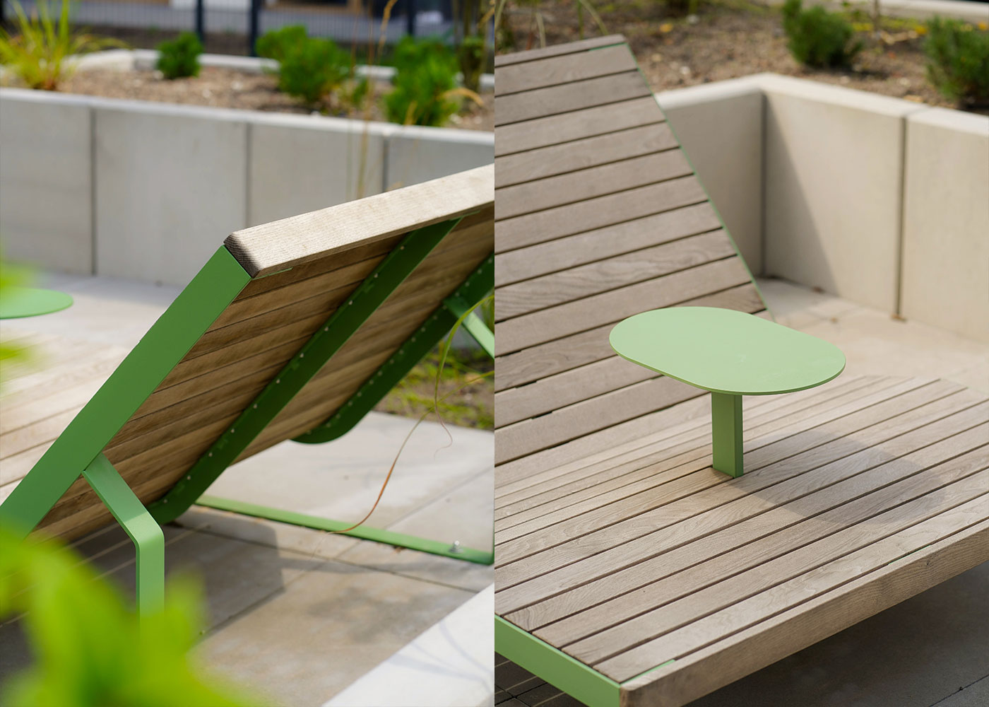 Diseñadas para dos personas e integrando una mesa central, estas piezas favorecen el descanso compartido y la interacción vecinal en un ambiente relajado. Su acabado en color verde refuerza la integración con la vegetación existente, potenciando una atmósfera natural y coherente con el entorno ajardinado.