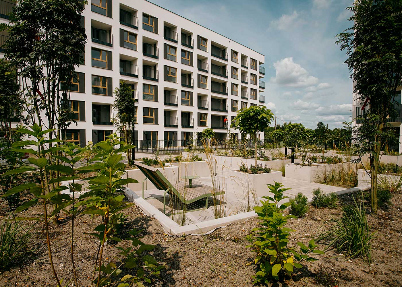 En esta zona residencial de Łódź (Polonia), la incorporación de tumbonas dobles PIRO, pertenecientes a la colección Benito Design+, redefine el espacio común como un entorno más confortable y conectado con el paisaje.