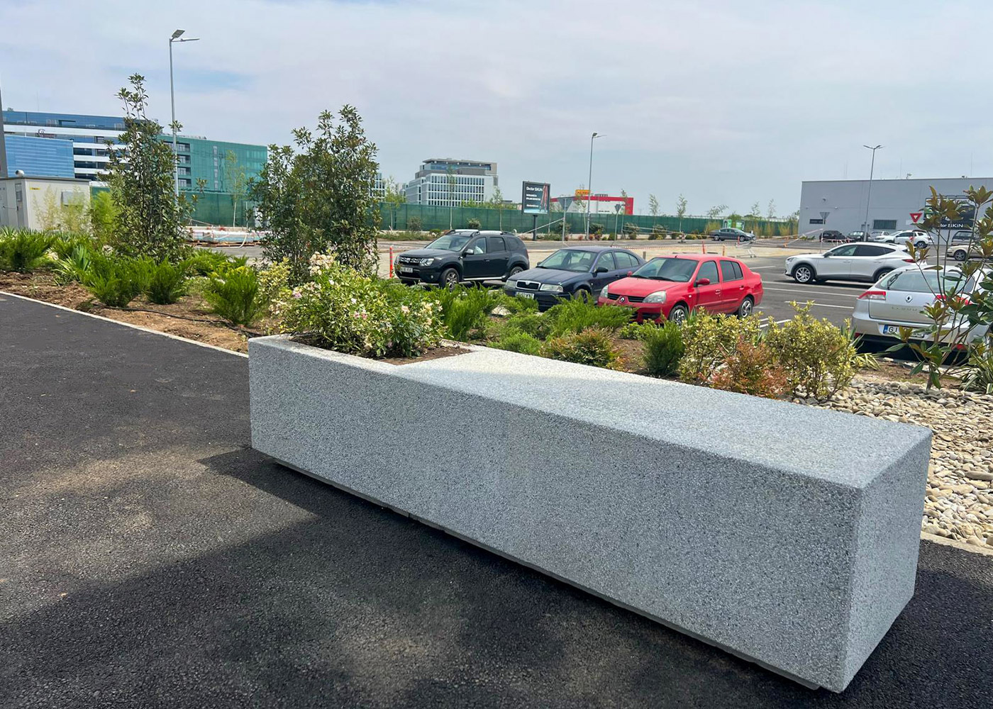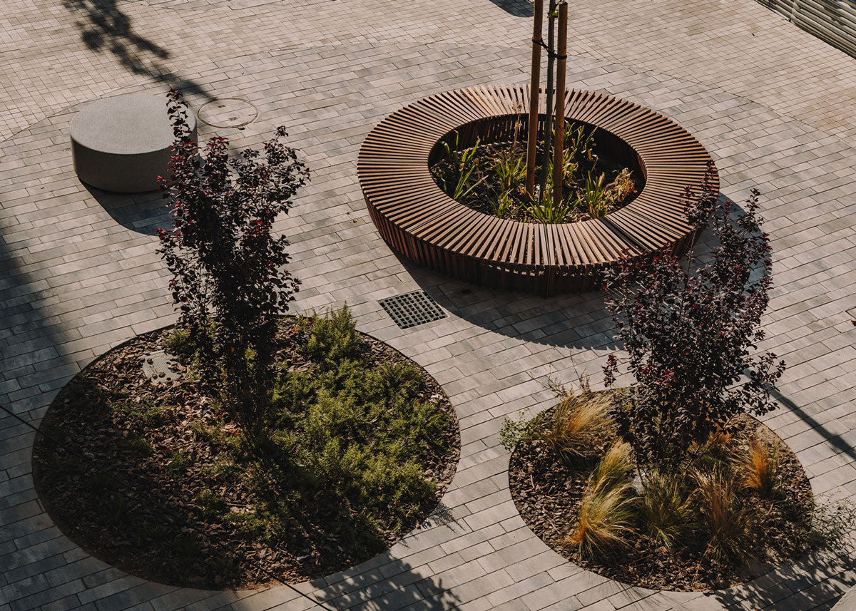 En Bucarest, se instalaron el banco/jardinera Kube y el alcorque Taulat para mejorar el espacio urbano, protegiendo árboles y creando un entorno más sostenible y agradable.