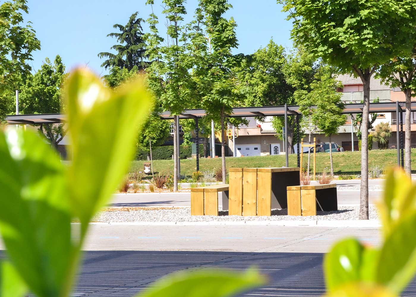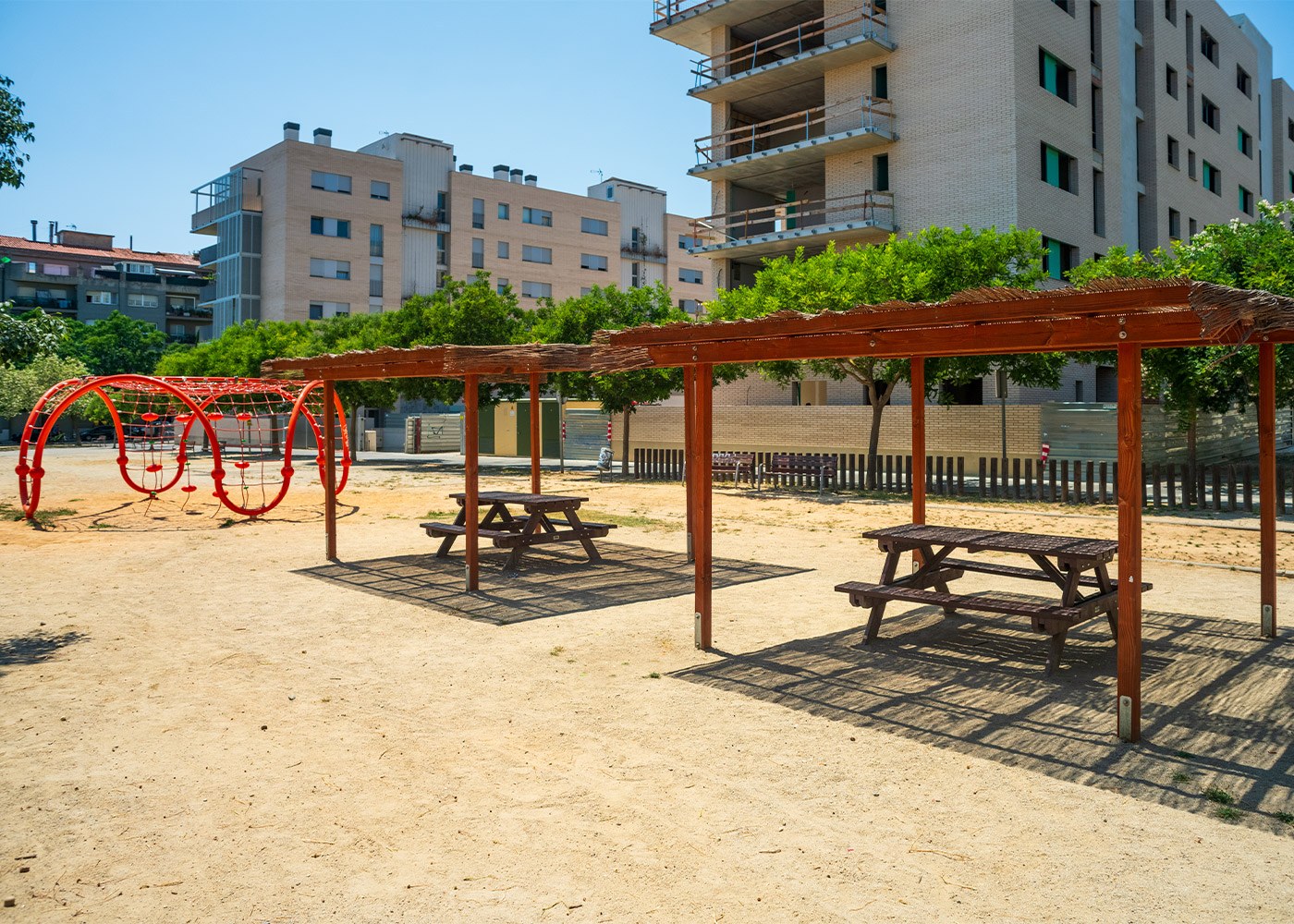 Renovación en Vilafranca del Penedés (Barcelona) con red CUAT para niños, mesas picnic Rebnew y pérgolas Kalahari con techo transpirable, creando un espacio de descanso ideal para el verano.
