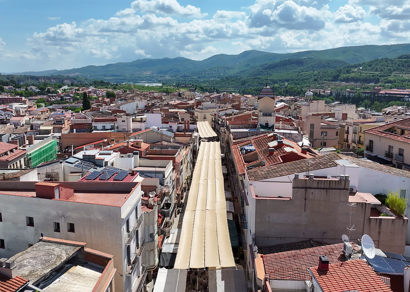 Instalación de velas horizontales como refugios climáticos, que ofrecen sombra, frescor y confort a vendedores y ciudadanos, combinando funcionalidad y estética en el espacio urbano.