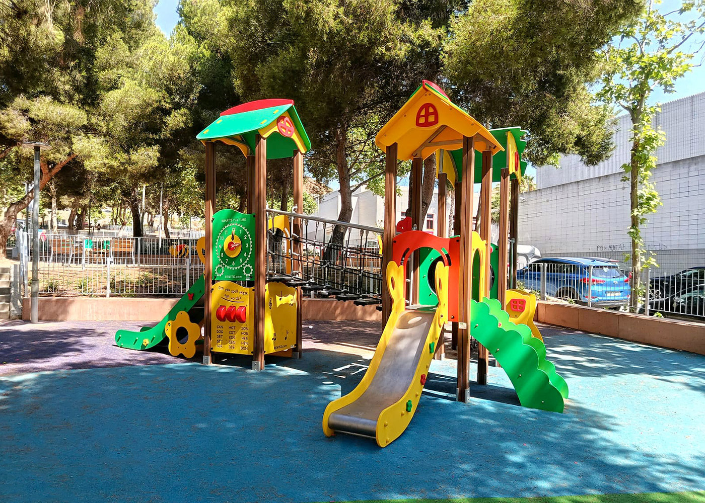 Nuevo parque infantil en Santa Coloma de Gramenet, Barcelona, con juego modular PINT y carrusel inclusivo MER. Equipado con bancos Neobarcino, ofrece un espacio moderno, accesible, integrador y acogedor.