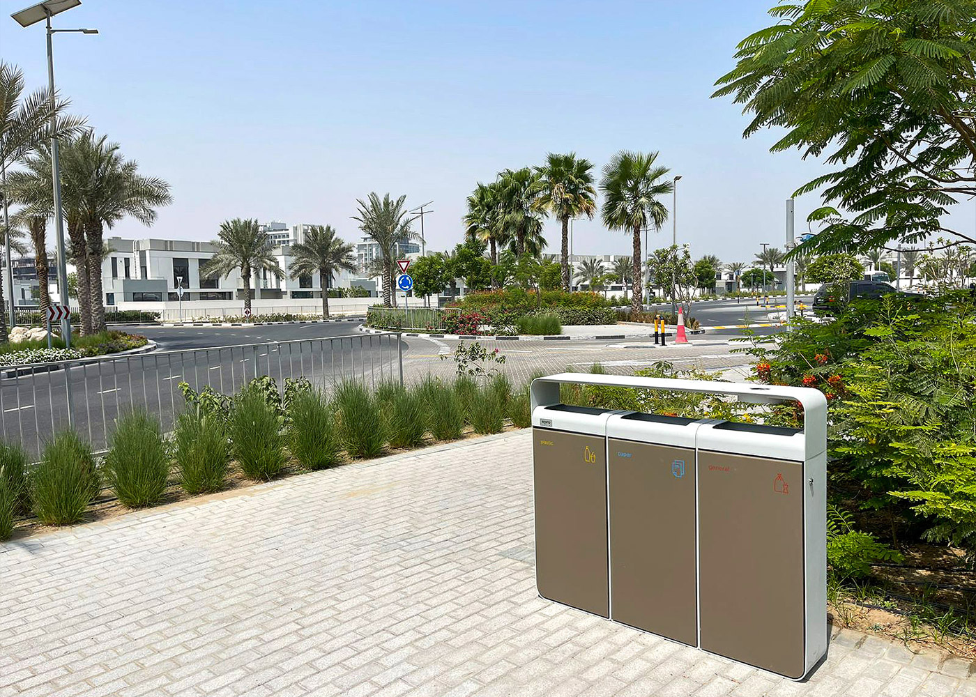 Instalación de papeleras de diseño FLO, de la colección Benito DESIGN+, con tres compartimentos y cenicero en la zona de Al Furjan, Dubái.