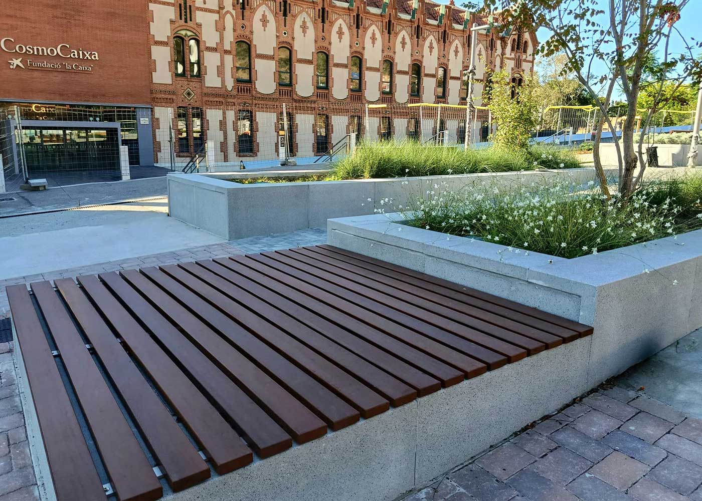 En el exterior del CosmoCaixa se han instalado tarimas de madera, y en el interior se han añadido mesas PIK en ReBnew, jardineras ReBnew y papeleras PICCO.