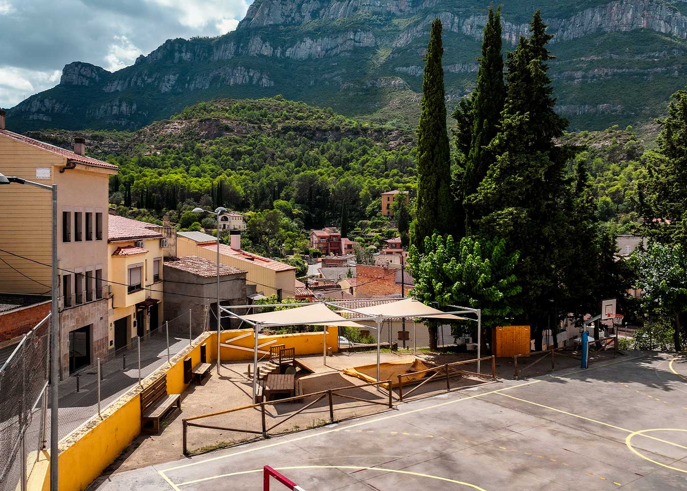 En la escuela infantil de Monistrol de Montserrat, Barcelona, se instalaron velas autoportantes que generan zonas de sombra en juegos y arenero del patio, protegiendo a los niños del sol.