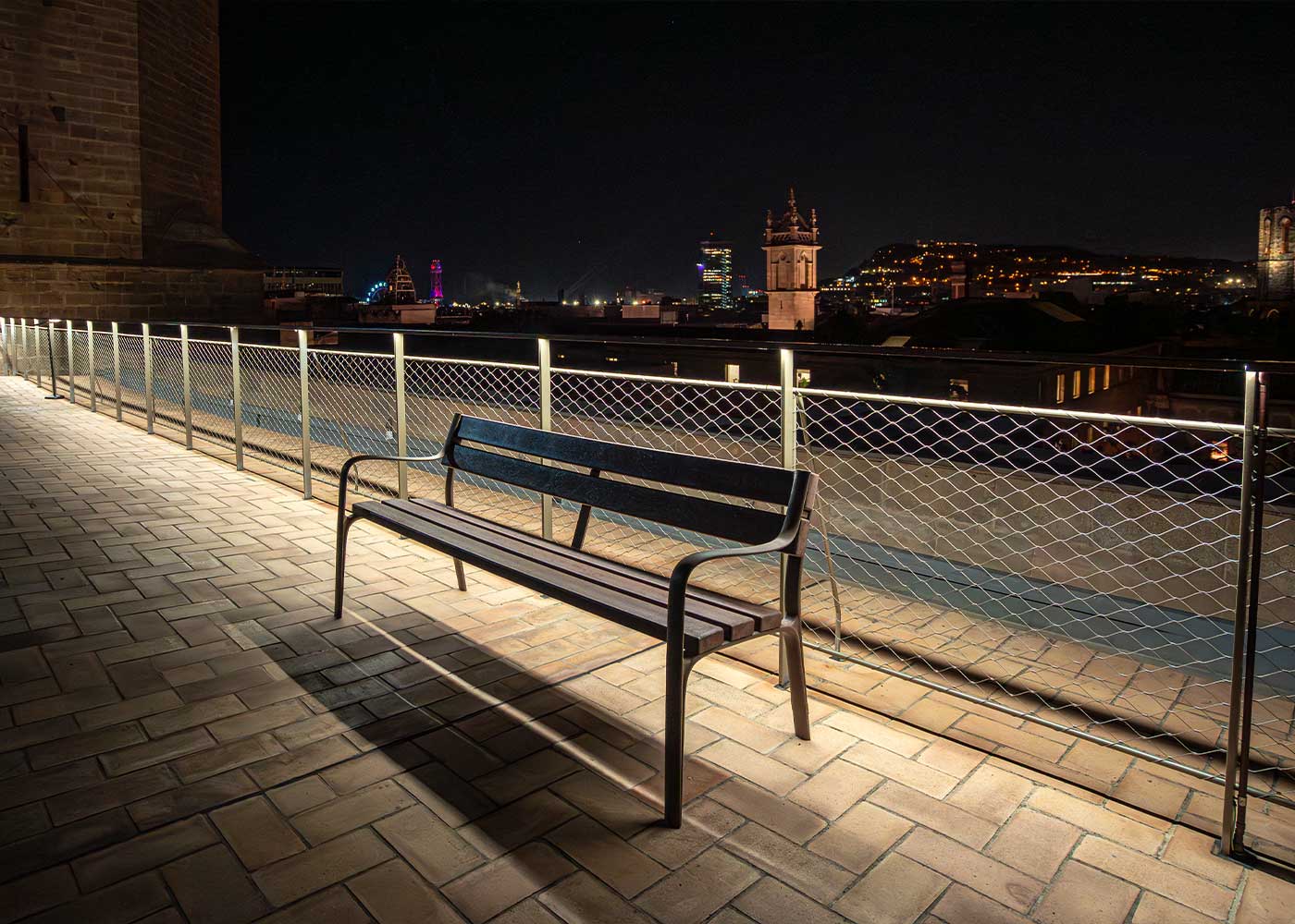 Solución de bancos Citizen ECO y papeleras GEA en la terraza de la Catedral de Barcelona, fabricados en ReBnew, plástico 100 % reciclado, para mejorar el confort y la sostenibilidad.