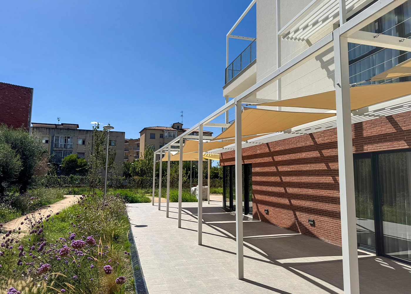 En la escuela infantil de Monistrol de Montserrat, Barcelona, se instalaron velas autoportantes que generan zonas de sombra en juegos y arenero del patio, protegiendo a los niños del sol.