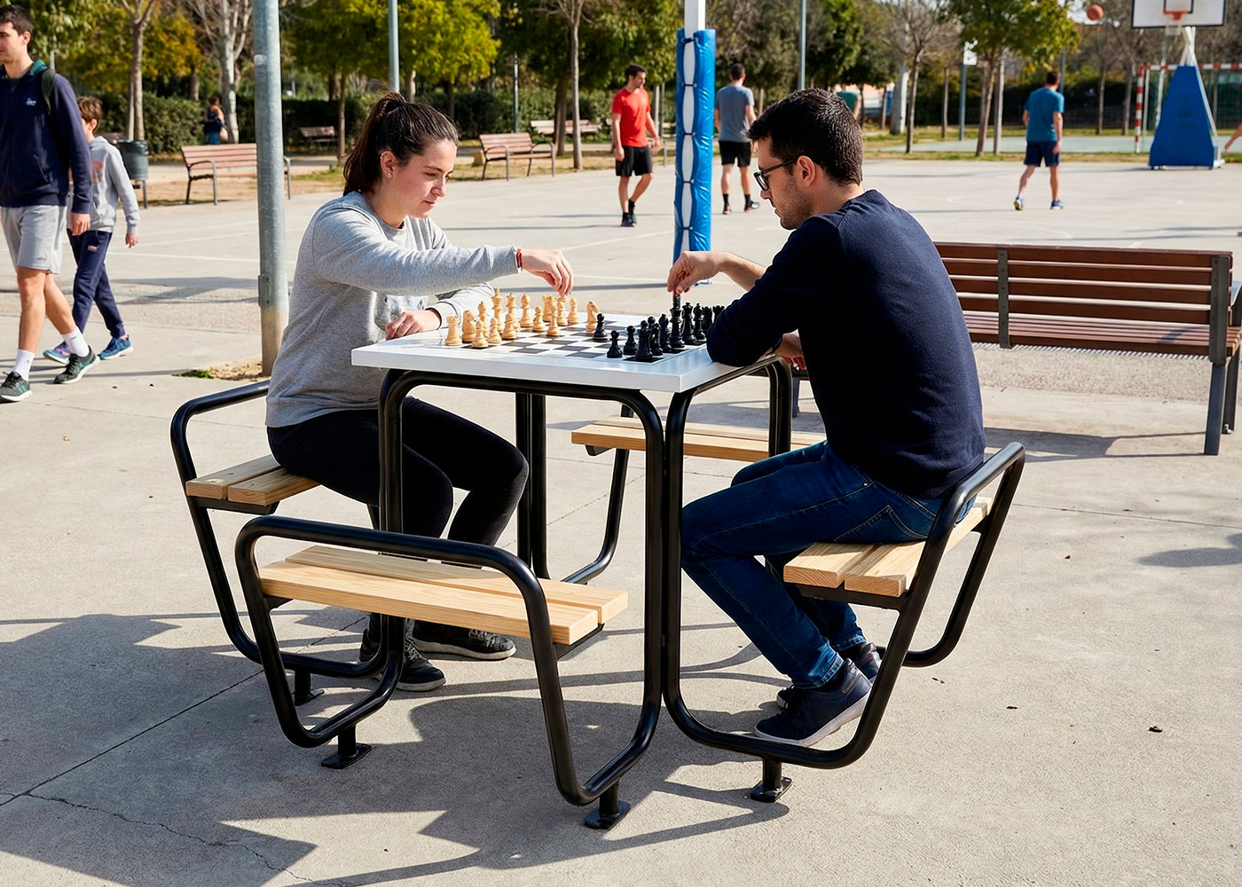 Mesa AJEDREZ, medidas totales (ancho x alto) 1850x750 mm, fabricada con tablones en madera de pino (tratados en autoclave vacío-presión clase 4 contra la carcoma, termitas e insectos) y tablero fenólico alistonada a contraveta. Estructura tubular de acero (tratado con el proceso Ferrus el protector de triple capa para el hierro, que garantiza una óptima resistencia a la corrosión). Anclada sobre superficie preparada (suelo blando o suelo duro), con pernos de expansión según superficie y proyecto.