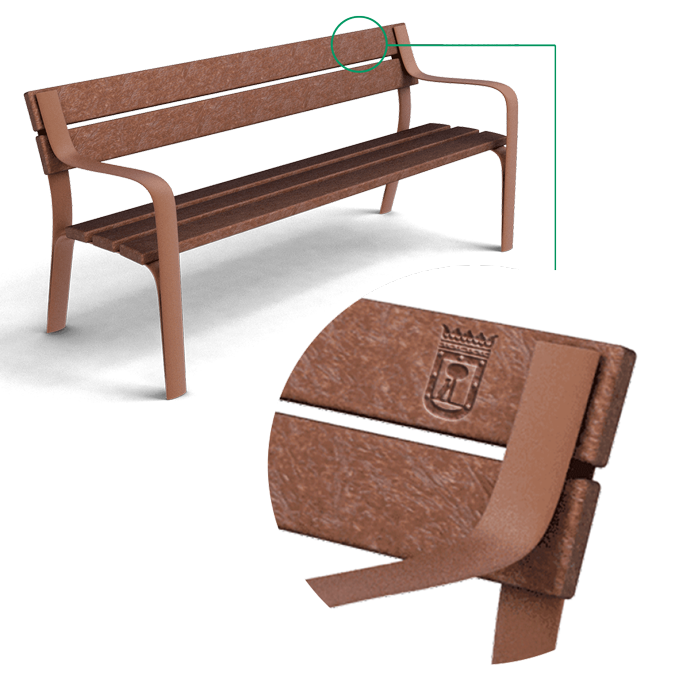 Banco de diseño CITIZEN ECO, medidas totales (largo x alto x profundo) 1800x810x650 mm, fabricado en plástico ReBnew (el polímero reciclado de BENITO que está producido íntegramente a partir de envases del contenedor amarillo y no requiere ningún tipo de mantenimiento) tanto los piés como el asiento y el respaldo con refuerzo de sección cuadrada metálico en el asiento para mayor resistencia estructural.Un banco al que no le afecta ni la humedad ni la corrosión. Tornillería de acero inoxidable. Preparado para anclaje con pernos de expansión M10 según superficie y proyecto.