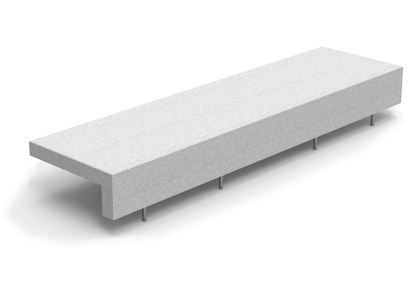 Banco de diseño ELA 3000, medidas totales (largo x alto x profundo) 3000x420x800 mm, fabricado con asiento de hormigón armado hidrófugo moldeado, color blanco granítico pulido, estructura de acero inoxidable mate. Apoyado sobre superficie preparada, por su propio peso.