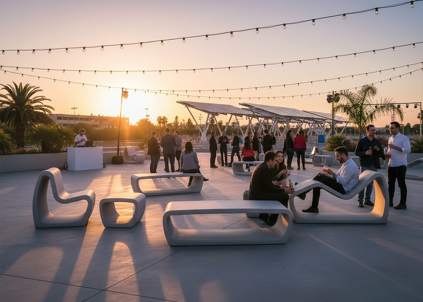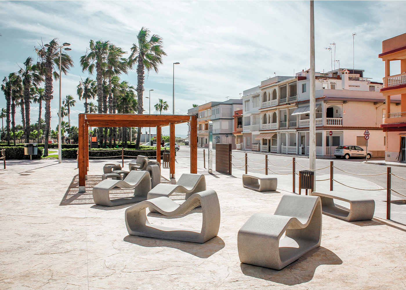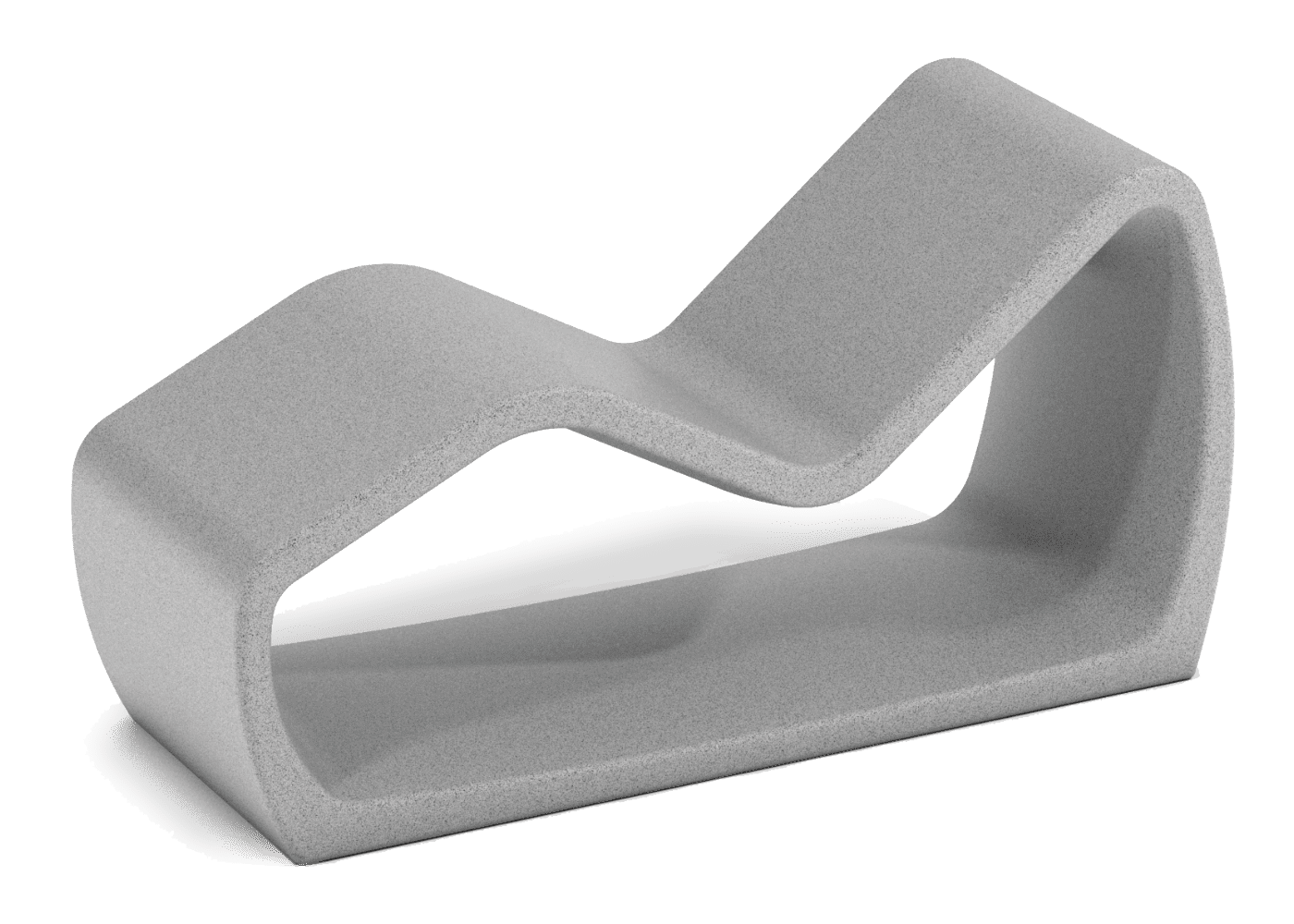 Tumbona de diseño PETRUS de, medidas totales (largo x alto x profundo) 600x820x1610 mm, fabricado con prefabricado de hormigón color gris granítico de aspecto rugoso. Se puede colocar en forma de elementos aislados o en grupos. Apoyado sobre superficie preparada, por su propio peso.