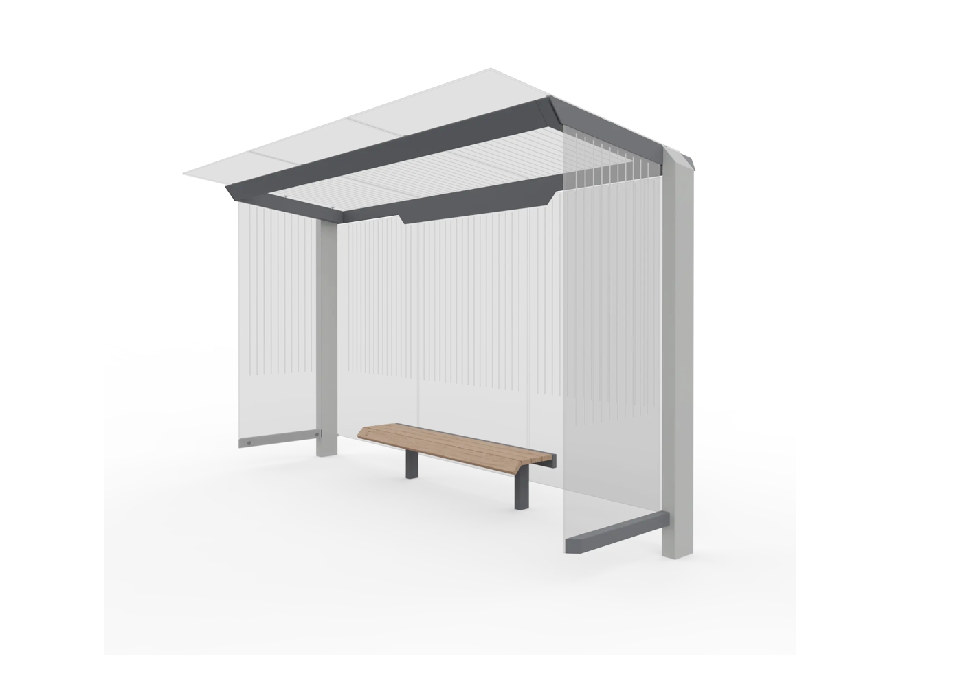 Marquesina de diseño, con estructura fabricada en acero (tratado con el proceso Ferrus el protector de triple capa para el hierro, que garantiza una óptima resistencia a la corrosión). Banqueta en madera tropical tratada con aceite protector. Cristal laminado.