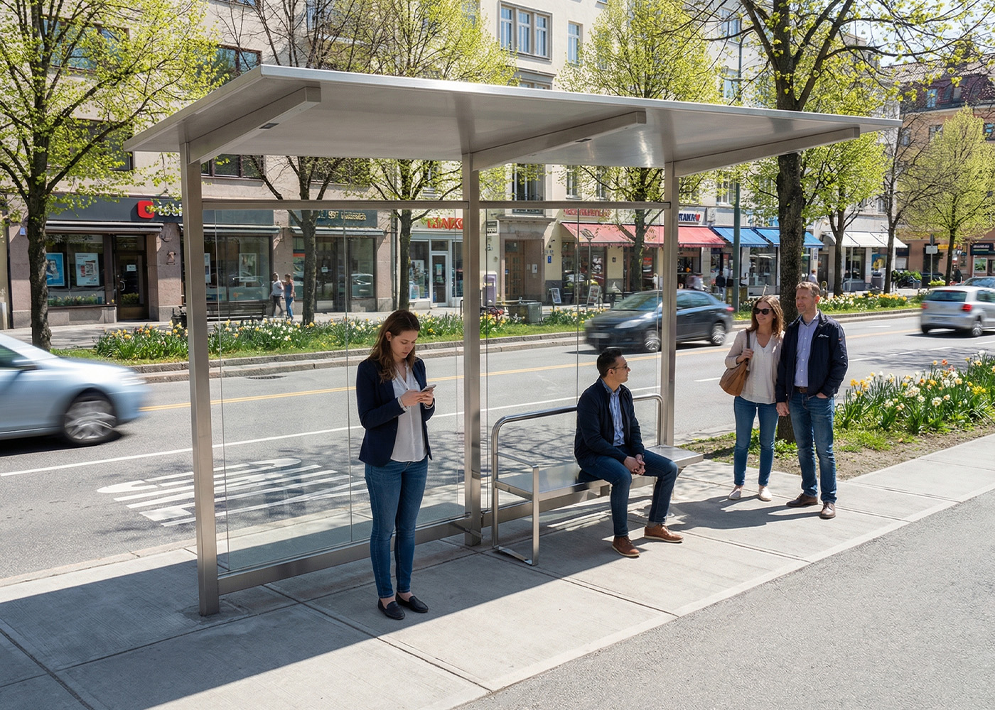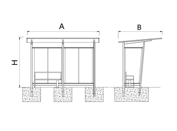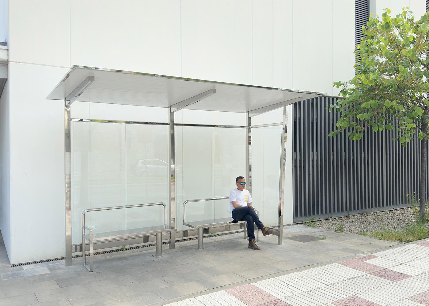 Marquesina con banco sin laterales STIL, medidas totales (largo x ancho x alto) 4000x2696x2020 mm, fabricada en acero inoxidable AISI-304 pulido brillante, con banco sin laterales. Panel tejado (inyectado poliuretano galvanizado y prelacado) con tres pilares de 80x80 mm, soporte para su fijación con escuadras y perfiles horizontales para cerramiento con cristal laminado de seguridad. Entregado en kit con accesorios e instrucciones de montaje. Anclaje recomendado: empotramiento en el suelo.