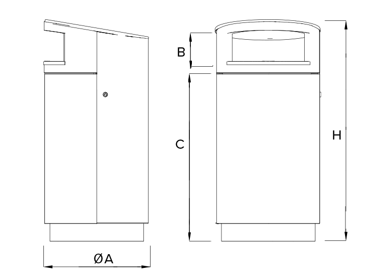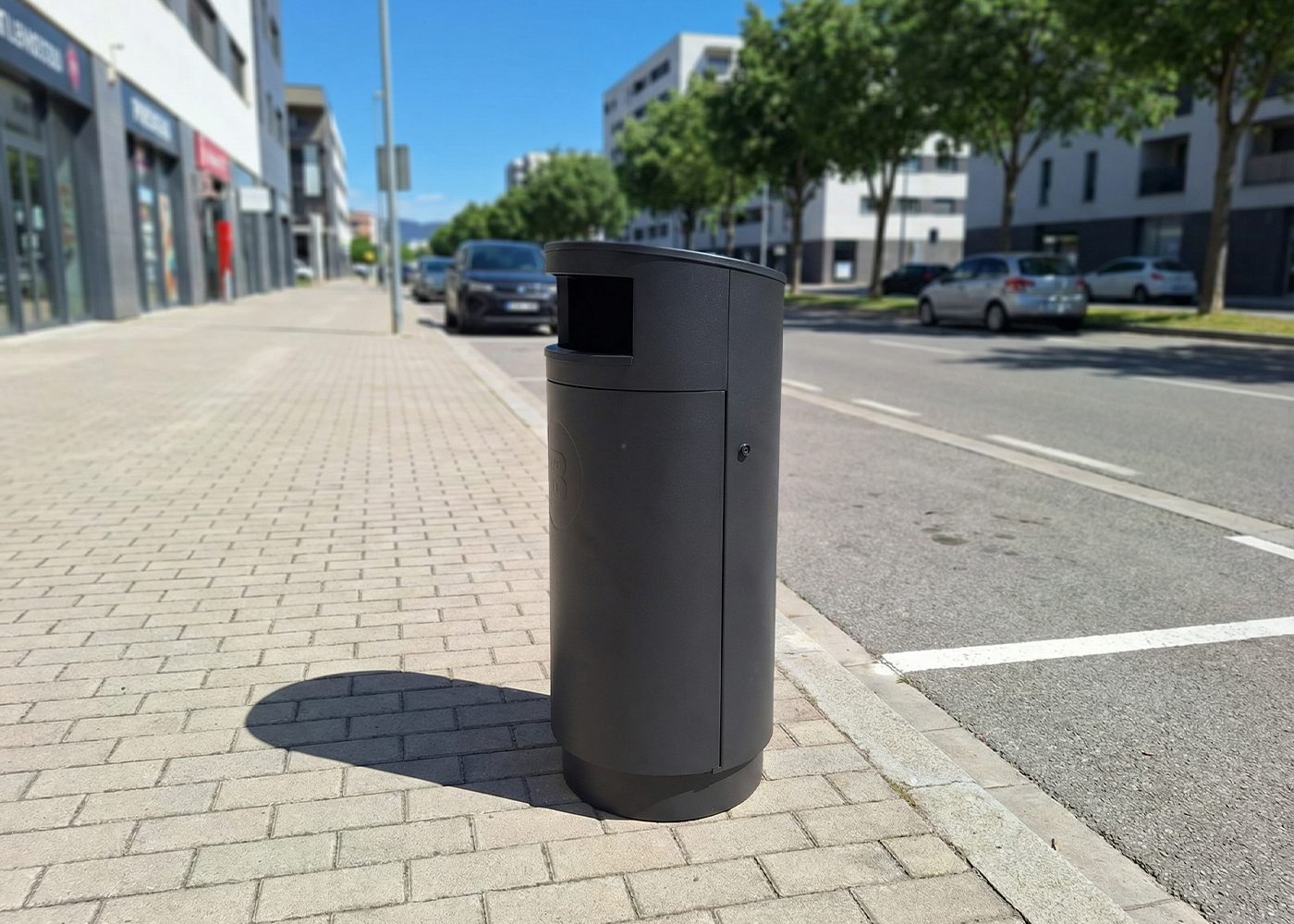 Gran robustez a causa del grosor de la chapa y al esqueleto estructural reforzado. Cierre con clave triangular estándar. Entrada de basura con apertura de 210° que permite el fácil acceso desde tres direcciones diferentes, así siente óptimo para instalar junto a paredes u otros elementos verticales. El sombrero protege el interior de la papelera del viento y la lluvia.