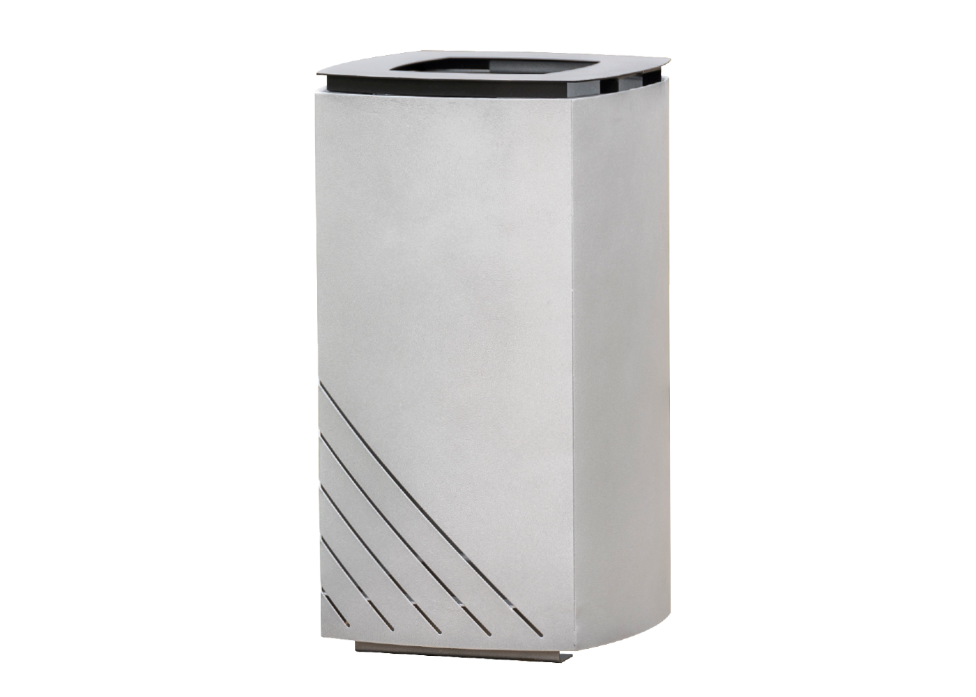 Papelera de diseño MIELEK, medidas totales (ancho x profundo x alto) 410x410x800 mm, 70 litros, fabricada en acero zincado con cubeta interior de acero galvanizado. Tratamiento antioxido de doble capa. Chapa de acero zincada y pintada en pintura poliéster en polvo. Imprimación epoxi. Pintura color plata. Incluye tapa con apertura mediante llave triangular estándar. Preparada para anclaje con tornillos Ø10 según superficie y proyecto.
