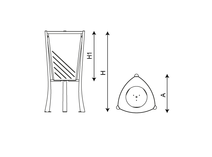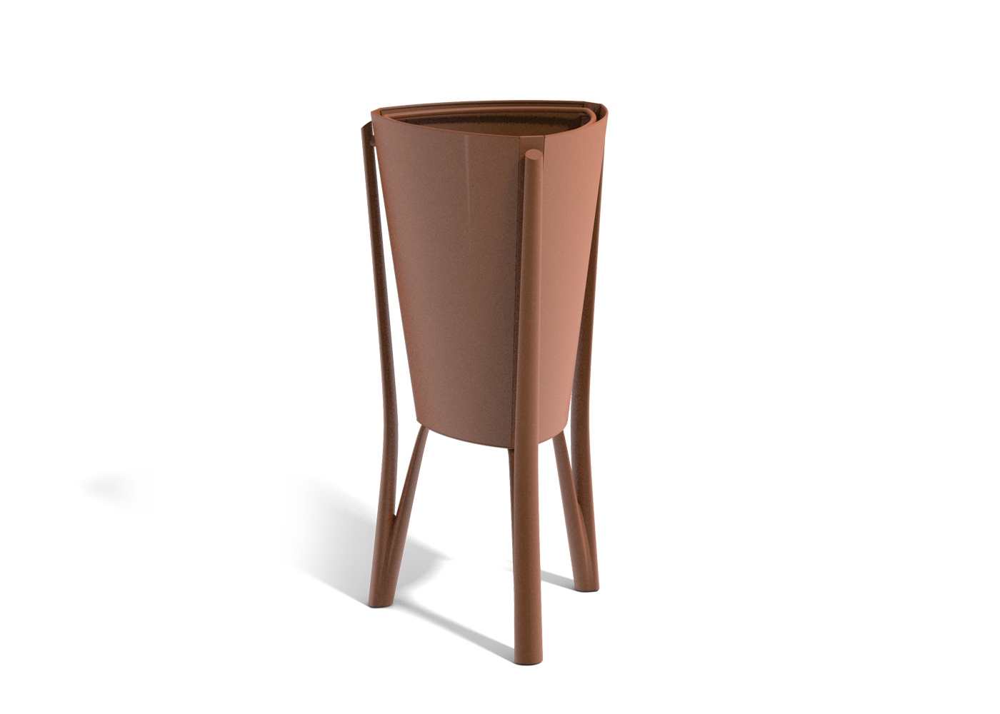 Cubeta y estructura en acero zincado y pintado. Cubeta con sistema de aro abatible para la bolsa de basura. Pies de fundición dúctil.