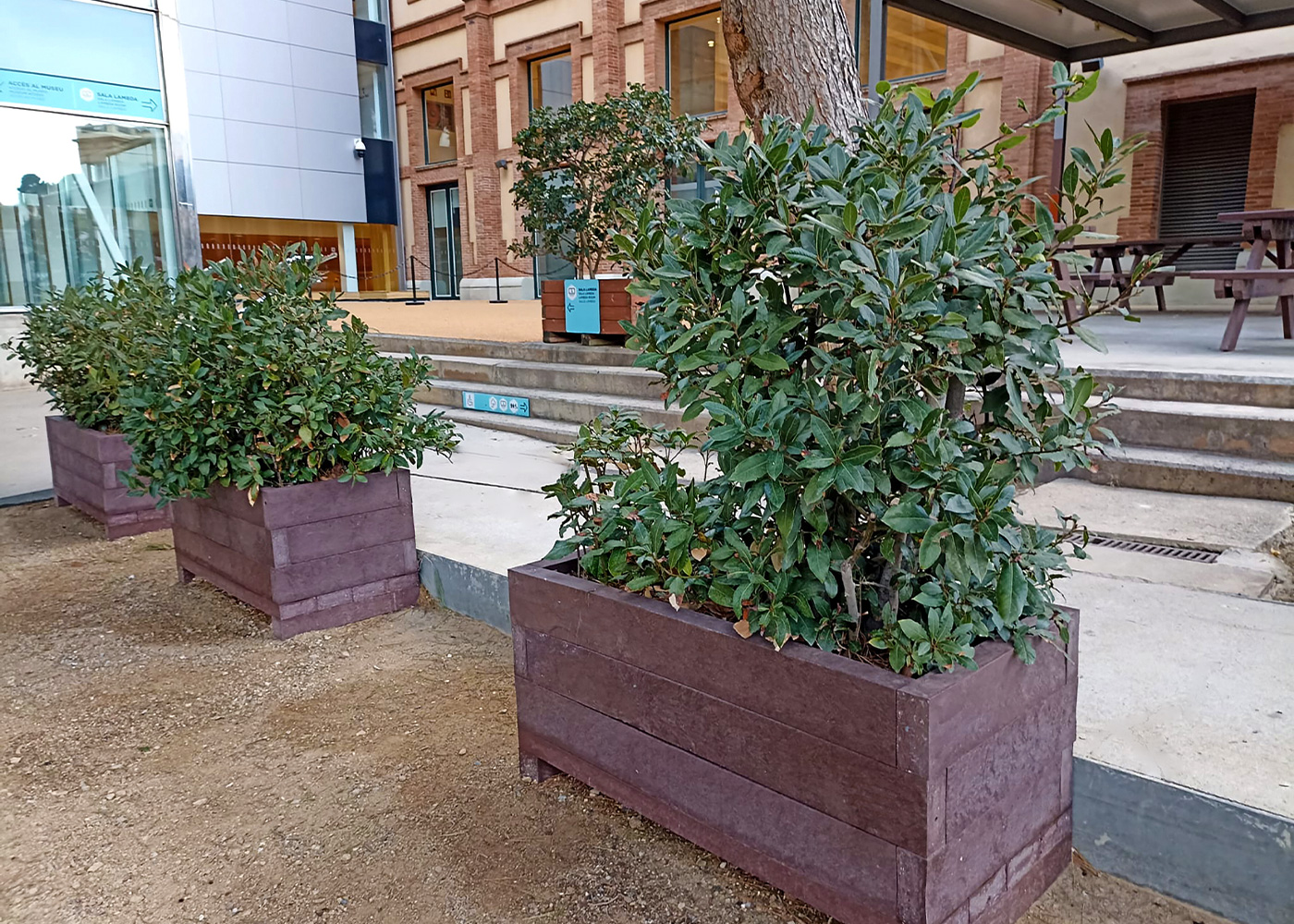 En el exterior del CosmoCaixa se han instalado tarimas de madera, y en el interior se han añadido mesas PIK en ReBnew, jardineras ReBnew y papeleras PICCO.