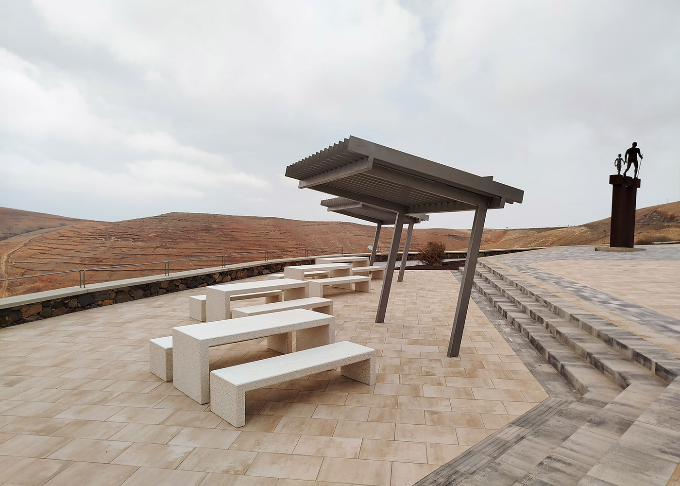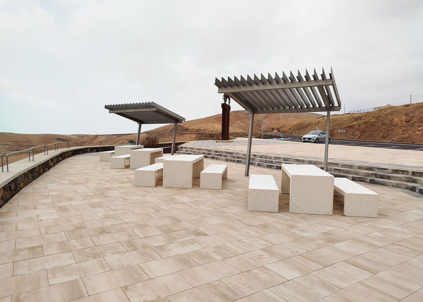 Instalación de mesas Kube de hormigón blanco en el mirador del Valle de Santa Inés, en la isla de Fuerteventura, creando un espacio de descanso integrado en el paisaje.