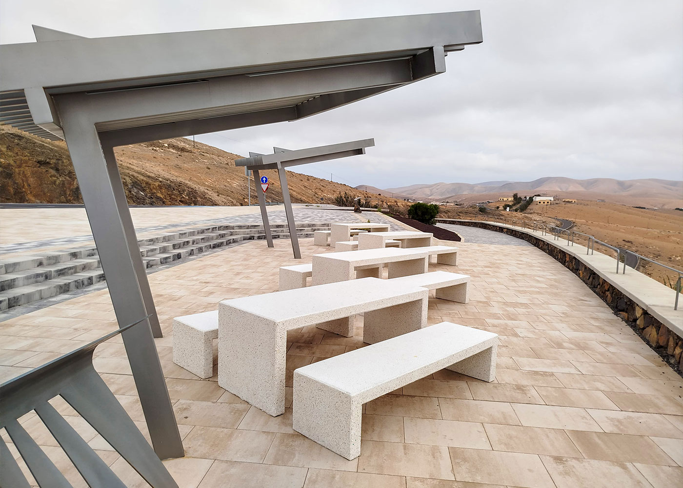 El Mirador del Valle de Santa Inés es un punto panorámico situado en la isla de Fuerteventura, en el municipio de Betancuria, concebido para ofrecer vistas privilegiadas del valle y de su entorno natural. En este enclave se han instalado mesas Kube fabricadas en hormigón blanco, con el objetivo de mejorar la experiencia de los visitantes y poner en valor el paisaje.